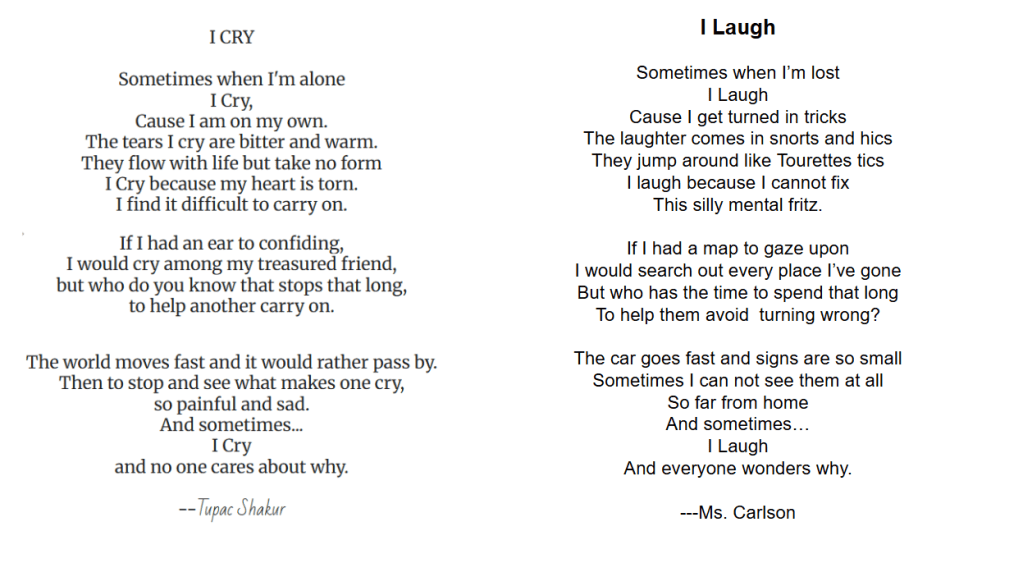 This week, I’m having my 8th graders use one of Tupac’s poems as a framework to write their own poems. I chose I CRY because it’s darn good…and clean! I can’t wait to see what they come up with. I am confident a few of them will use some bodily functions and a skibiddy toilet will most definitely be mentioned in at least one, but hopefully they will have fun with it. Just for fun, I’m including the original and MY take on it. If you know me you will laugh. If you don’t, you’ll be glad you don’t need me to drive you anywhere.